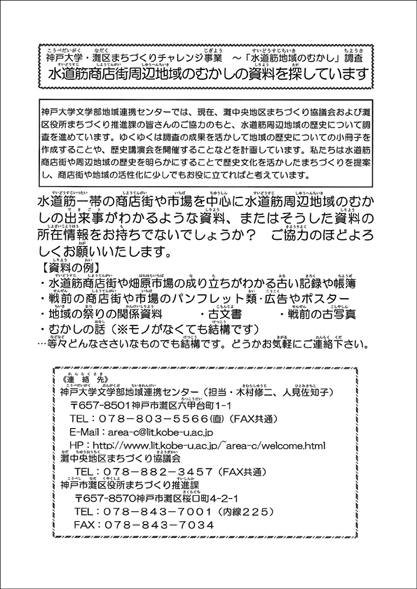 灘区を東西に横切る水道筋には、大正期より商店が集まりはじめ、今日では神戸市内でも屈指の規模を誇る商店街を形成している。しかし、これまでのところ商店街の形成過程を含めた水道筋の“前史”については、『新修神戸市史』を含めあまり詳しい叙述はない。本活動では、古文書や新聞・写真といった歴史資料を博捜し、商店街形成以前における水道筋地域の歴史を可能な限り明らかにする。そしてその成果を小冊子のような形にまとめ、地域に住まわれる方々にできるだけ広く配付し、当該地域の歴史文化の豊かさに関心を持っていただくことを目指す。そうすることにより、さらなる地域資料の掘り起こしから活用まで見据えた長期的な視野に立つ事業への足がかりにもなるものと考える。また本活動を機軸に据えて進める事業によって得た成果(歴史コンテンツ)が水道筋地域のまちづくりのための材料となって地域の活性化が図られることをねらいとしている。さらに、本活動の過程では、地域の中でまちづくりのための活動を進めておられる諸グループとの継続的な連携関係を構築してゆきたいと考えている。このことは、先に述べたより長期的な視点から本年度の活動を進めてゆくという点にも密接につながるものと考える。
