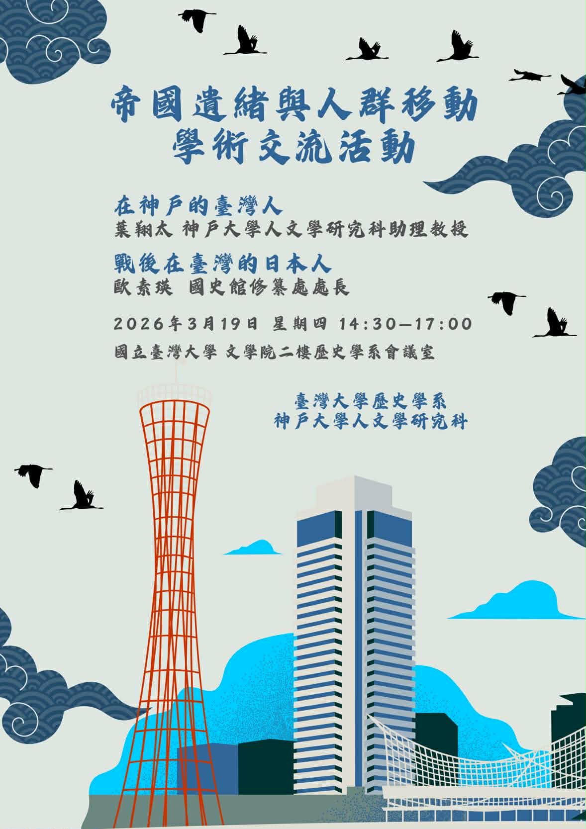 2026年3月19日に、本研究科は本学の協定校である国立台湾大学(台湾)を会場に、台湾大学歴史学系と共催で国際ワークショップ「帝國遺緒與人群移動學術交流活動」を開催します。